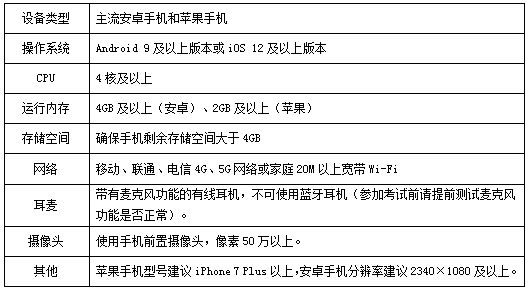 1.设备要求:考试支持计算机、Pad和手机3种设备类型,考生根据自身情况自备考试设备(至少1种),设备具体要求如下: